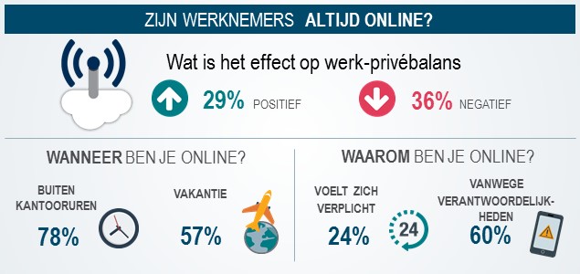 Werknemers zijn meer dan ooit altijd inzetbaar. Ruim 71% van ondervraagden hebben tenminste een mobiele telefoon, een laptop of tablet van het werk. Gevraagd naar het gebruik, zei in totaal 59% dat zij het uitsluitend gebruikten voor beroepsdoeleinden. Hoe hoger de functie echter, hoe meer het onderscheid verdwijnt; 51% van de managers zegt dat zij het toestel zowel voor hun werk als privé gebruiken.